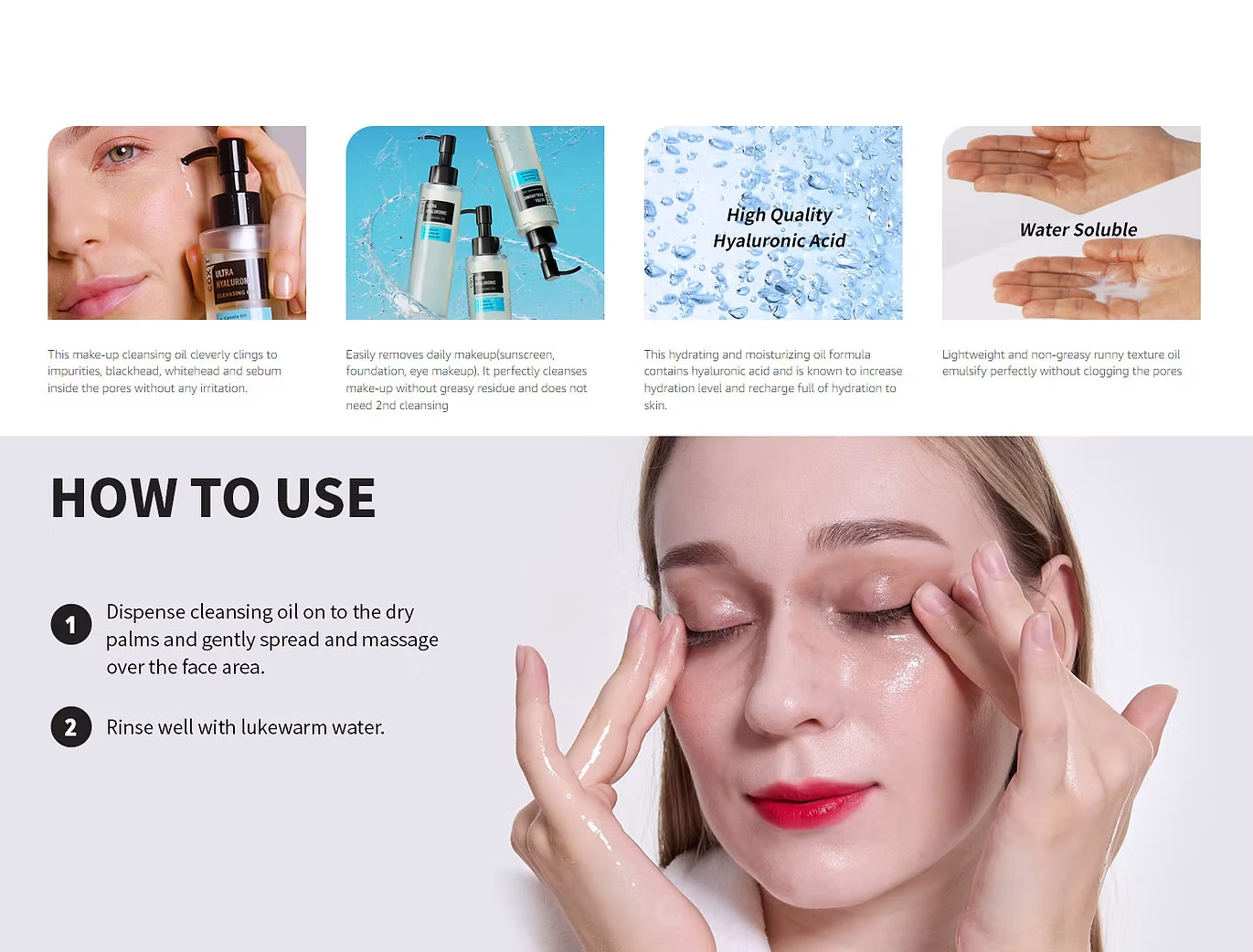 Perfect Make-up & Blackhead Remover: This make-up cleansing oil cleverly clings to impurities, blackhead, whitehead and sebum inside the pores without any irritation. Easily removes daily makeup (sunscreen, foundation, eye makeup). It perfectly cleanses make-up without greasy residue and does not need 2nd cleansing.